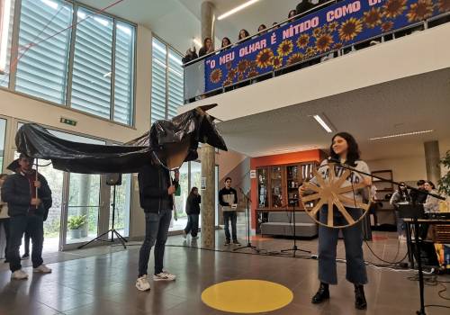 Durante o intervalo das 10 horas, as turmas do 12ºA, 12ºB e 12ºC abrilhantaram o átrio da Escola, com a apresentação de várias músicas relacionadas com o tema, enquadrando assim a dramatização do poema, estudado nas aulas da disciplina de Português.