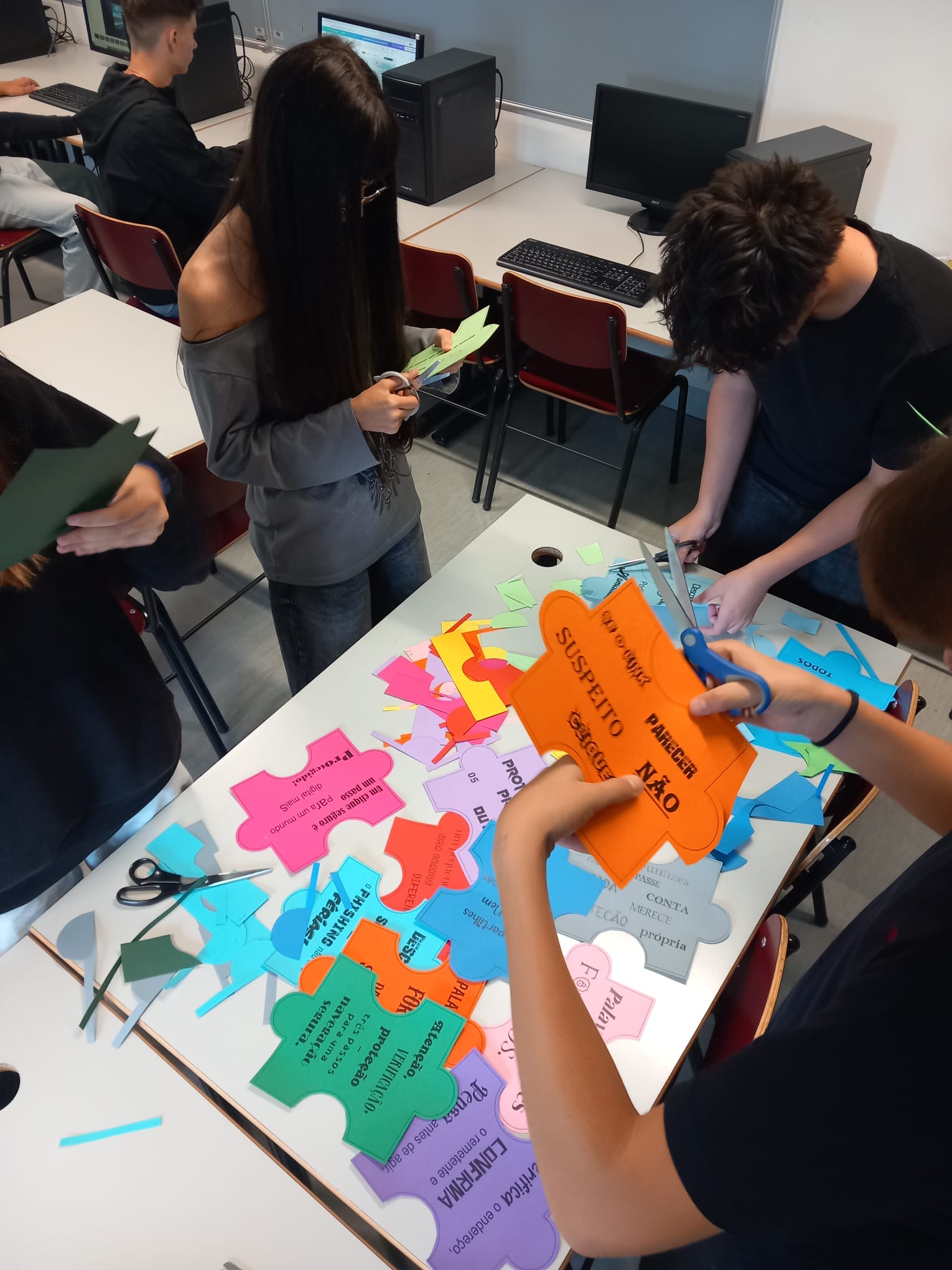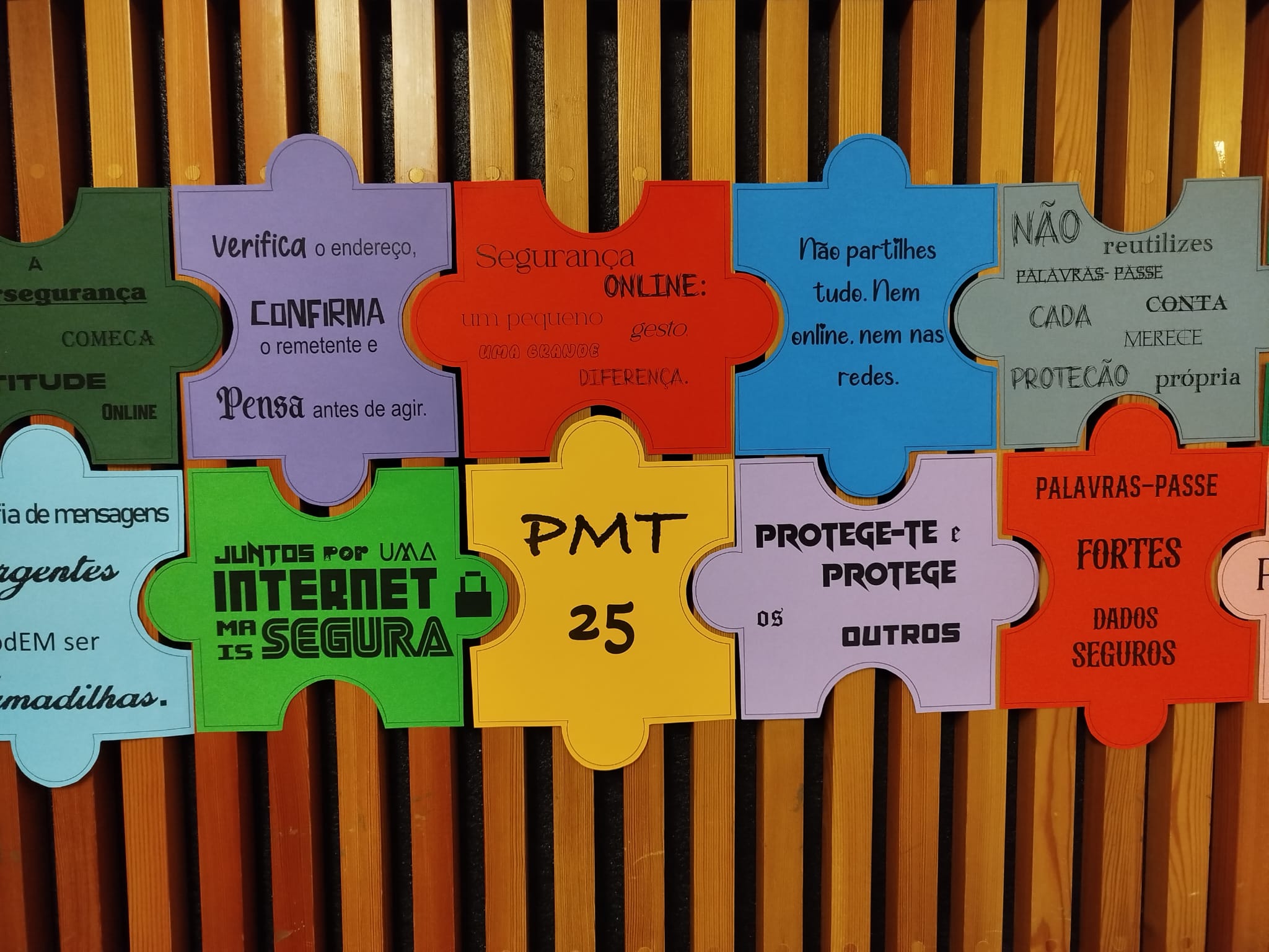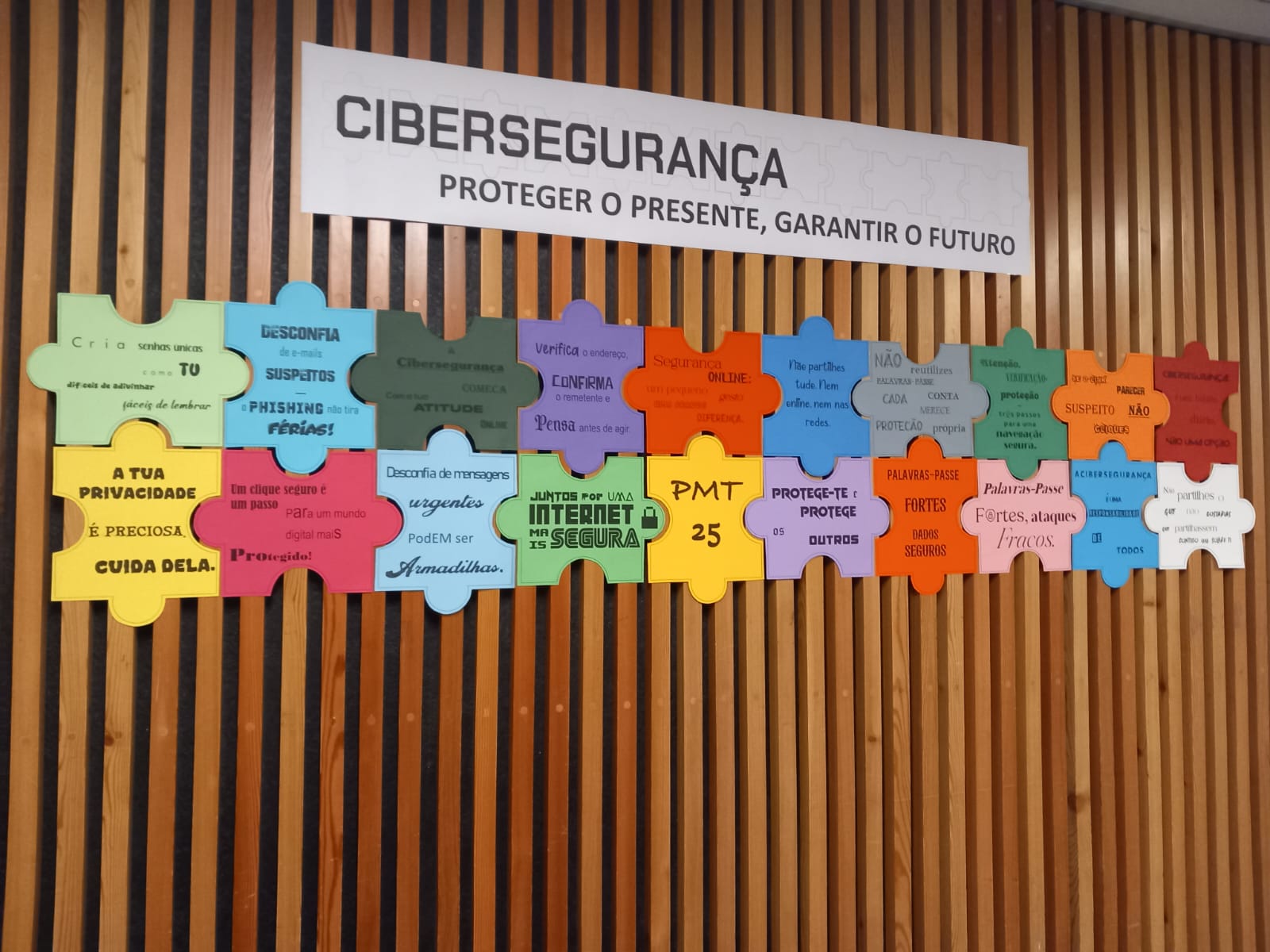 No âmbito das disciplinas de DCA (Design, Comunicação e Audiovisuais) e TM (Técnicas de Multimédia), os alunos do 10º ano do Curso Profissional de Multimédia (PMT25) criaram um puzzle com frases de sensibilização sobre cibersegurança, desafiando a comunidade escolar a refletir sobre boas práticas no mundo digital.